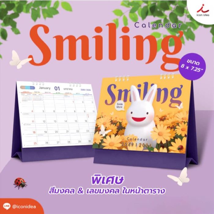 รายละเอียด ปฏิทินตั้งโต๊ะ Smiling 2569/2026 ขนาด 8x7.25 นิ้ว งานพิมพ์คมชัด ฐานแข็งแรง มีสีมงคล & เลขมงคลในหน้าตาราง เหมาะเป็นของขวัญปีใหม่ - ดีไซน์น่ารักสไตล์ Smiling วางแล้วมุมโต๊ะสดใสขึ้นทันที - Lucky Color & Lucky Number บอกในหน้าตาราง ใช้งานและเสริมกำลังใจทุกเดือน - ประเภท: ปฏิทินตั้งโต๊ะ (Desk Calendar) - ปีปฏิทิน: มกราคม–ธันวาคม 2026 (พ.ศ. 2569) - ขนาดรวมฐาน: 8 x 7.25 นิ้ว - จำนวน 16 หน้า - รายละเอียดพิเศษ: มี สีมงคล และ เลขมงคล ในหน้าตาราง - วัสดุ: กระดาษอาร์ตการ์ด 230 แกรม / พิมพ์ 4 สี สองหน้า / ฐานแข็งแรง - แบรนด์: Icon Idea